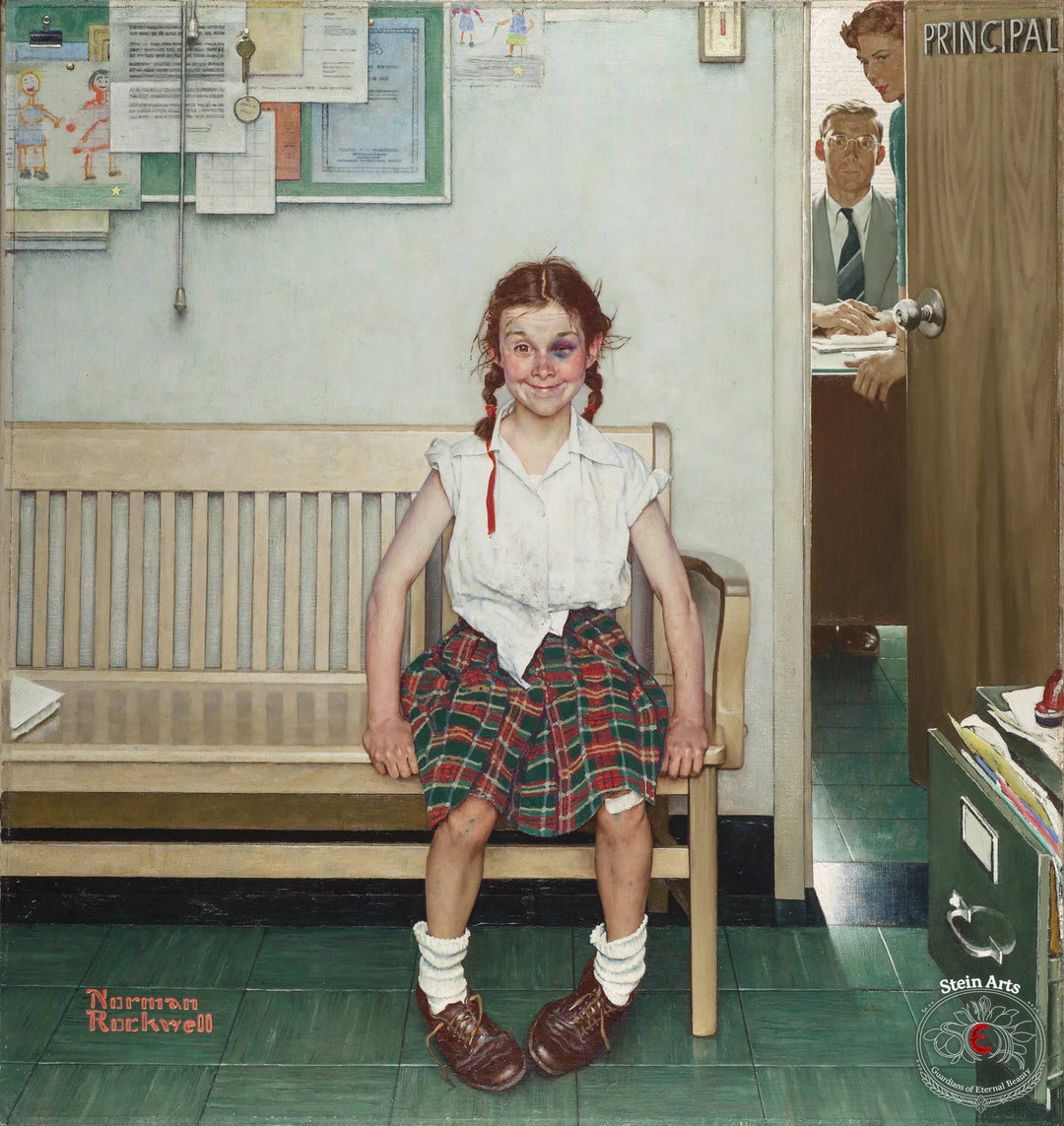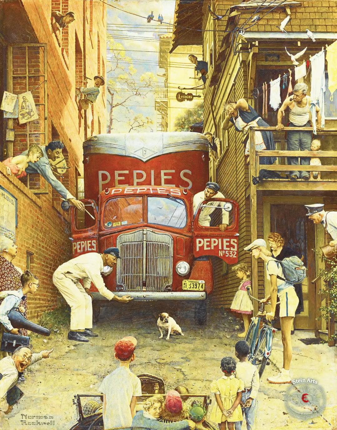 Despite seeing himself primarily as an illustrator and not an artist, his work influenced contemporary artists like Edward Hopper and Norman Lindsay, who admired his ability to tell emotionally charged visual stories. The attention to detail in clothing, facial expressions, and the environment was a constant in his works, turning each scene into an idealized reflection of American life. After the war, Rockwell began to tackle deeper themes, such as racial injustice, as shown in "The Problem We All Live With" (1964), where he exposes the struggle for civil rights.